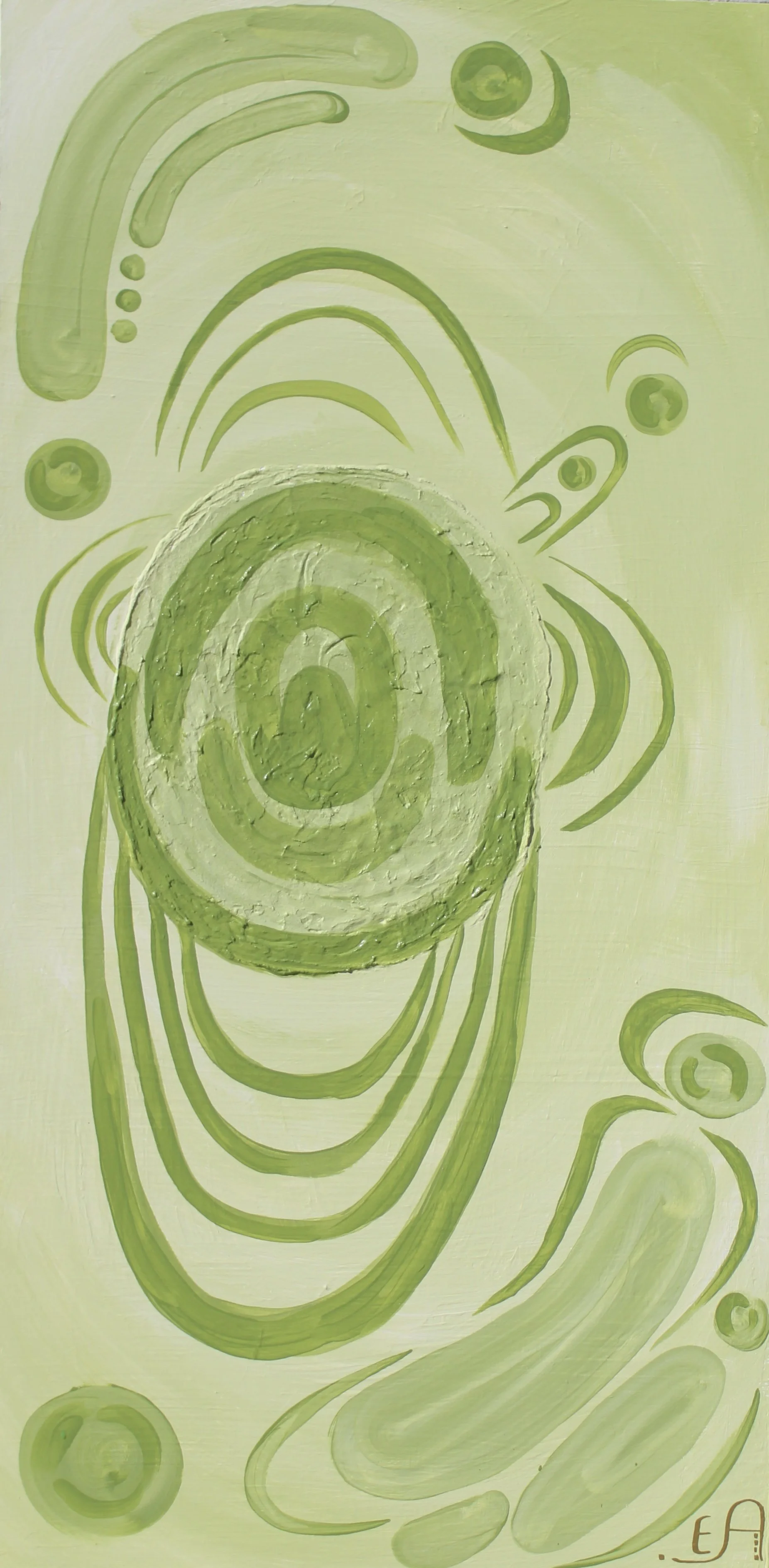This expression is about the culmination of moments when life feels heavy, heartbreak, endings, or simply losing your way. The darker brush strokes represent this pain and doubt trying to peirce in while the lighter cell-like forms are seen as the emerging stages of healing. It is about learning how to turn inward, cocooning for a time, and slowly relearning self protection and stepping back into the light.